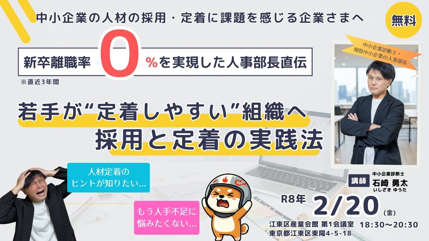 弊社の提携コンサルタントである中小企業診断士の石崎 勇太さん、同じく田中 一朗さんとの共同で人事セミナーを開催します!