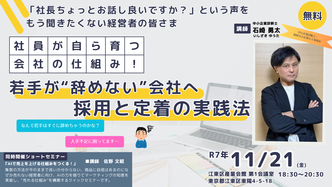 弊社の提携コンサルタントである中小企業診断士の石崎 勇太さん、同じく田中 一朗さんとの共同セミナーを開催します!
